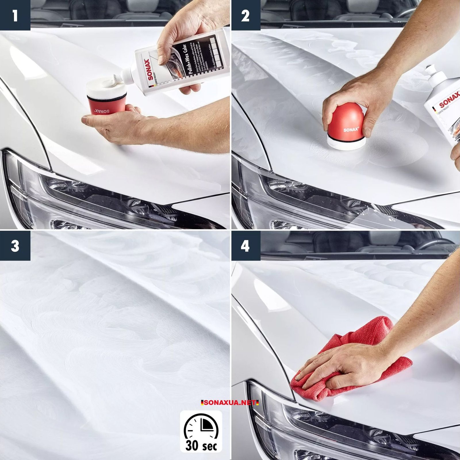 Цветовой пигмент полироля затушевывает мелкие царапины и делает их невидимыми. Защитное покрытие из воска карнауба отторгает грязь и воду, тем самым обеспечивая автомобилю медленную скорость загрязнения. Полироль создан на водной основе и не содержит растворителей. Перед применением полироля, рекомендуется вымыть автомобиль. Нанести полироль тонкой пленкой на сухое или слегка влажное покрытие и распределить по поверхности площадью примерно 1 м.кв. при помощи губки. Отполировать поверхность до блеска мягкой салфеткой из микрофибры. Закончив обработку одного участка, переходите к следующему. Остатки полироли удаляйте с поверхности при помощи салфетки из микрофибры. В зависимости от толщины накладываемого слоя полироли можно добиваться разной глубины оттенка основного цвета. Шкала глубин цвета приведена в нижней части лицевой этикетки полироли.
